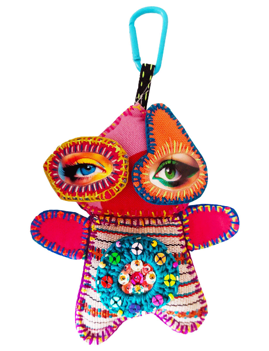 Her striking form is a celebration of “freeform” artistry, moving away from traditional symmetry to capture a truly spontaneous and independent spirit. She features wide, expressive eyes with a unique shape that defies the standard, giving her a look of constant wonder and independence. Her body is a rich tapestry of textures, blending bold patterned weaved fabrics with meticulous hand-embroidery and shimmering beaded elements with sequins that radiate from her center like sparks of inspiration. Every detail is a testament to the joy of letting the materials guide the needle, creating a character that is as bold as she is charming.