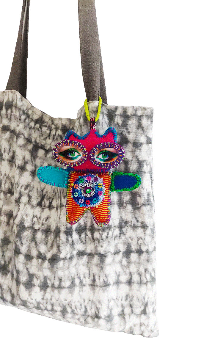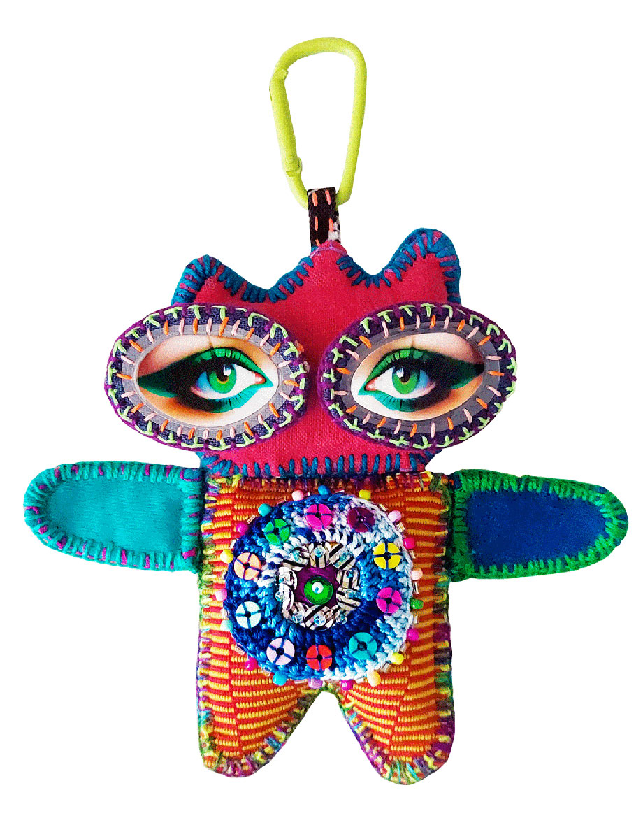 Her delightful form, with its enchanting and charming green eyes, beautifully weaves together round crochet, colorful beads, and shimmering sequin embellishments, reflecting a spirit of playful elegance. Crafted with thoughtful design and a mix of hand-stitched details, she is a true one-of-a-kind creation with a whimsical charm and a unique, playful personality.